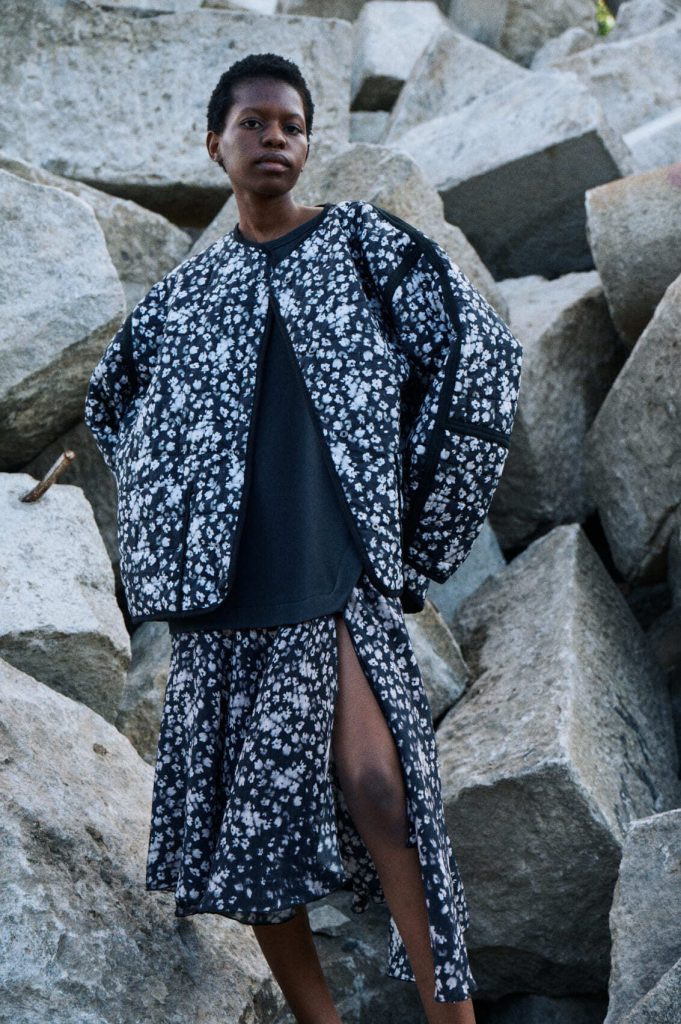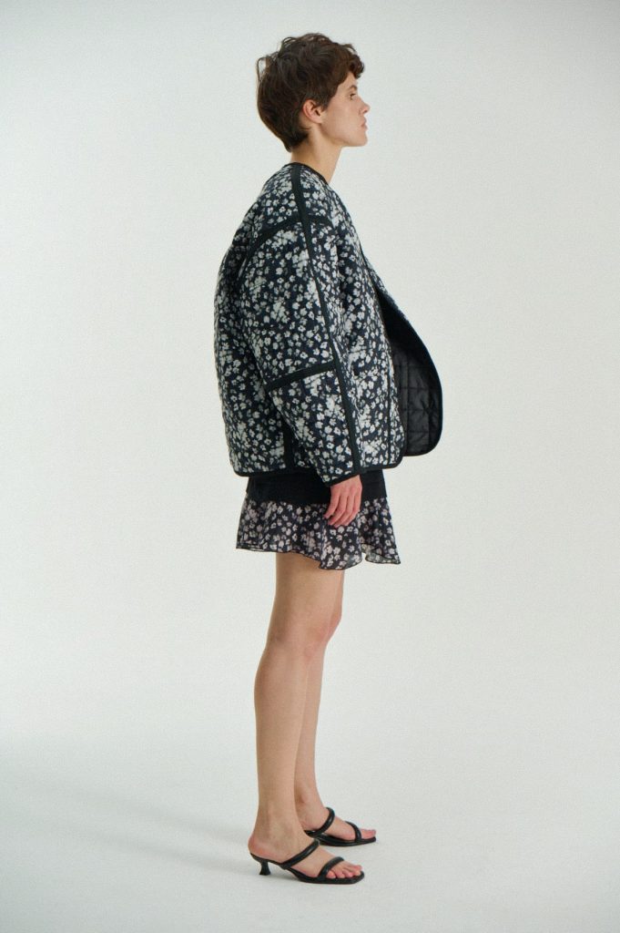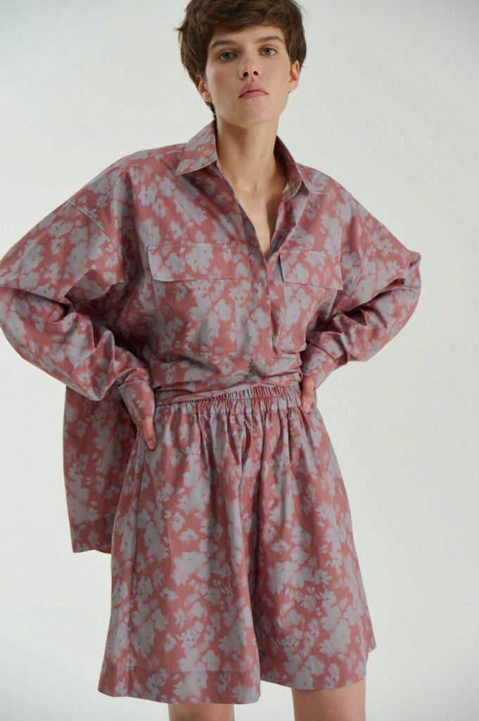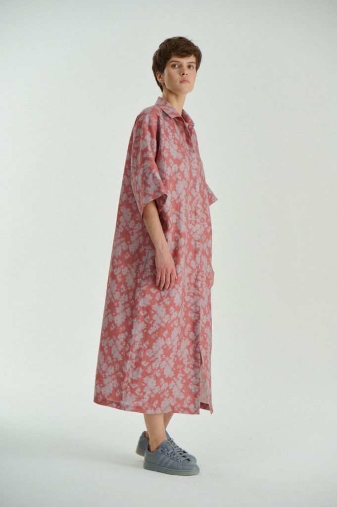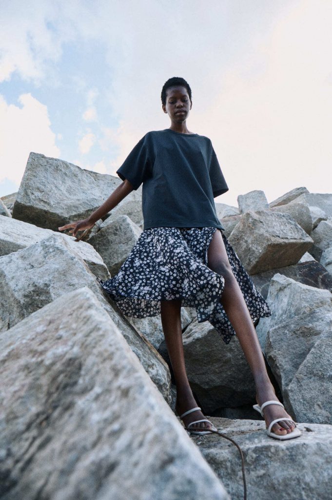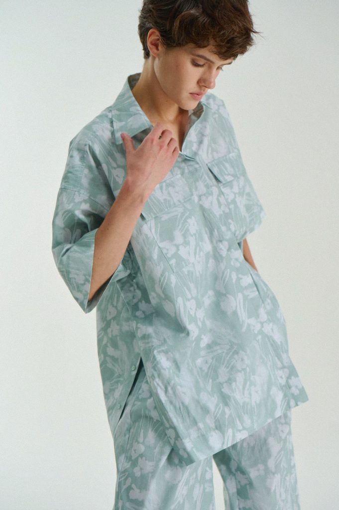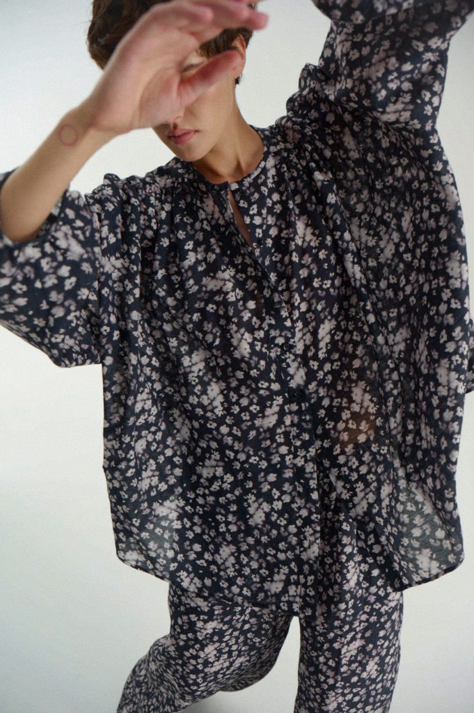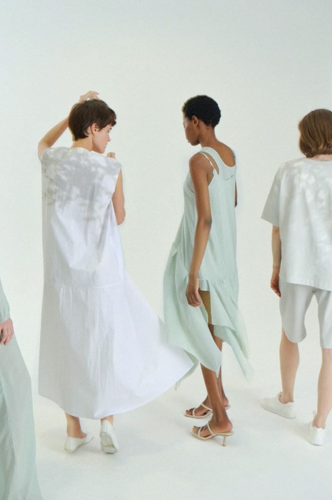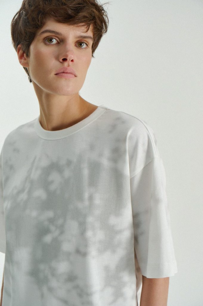 Для первой летней коллекции мы вдохновлялись мягкой загородной природой — полевыми цветами, тенями от деревьев и выбеленными сочетаниями цветов. Размытые полевые цветы, нарисованные в набросочной манере легли в основу ink дропа, где рисунок напечатан на струящейся вискозе, и хлопке, ставшим внутренней стороной стеганой куртки. Stone дроп — в него вошли элегантные вещи из конопли и шуршащего хлопка в холодном сером оттенке. Shadow дроп — платье и футболки с принтом в виде упавших от лиcтьев теней и отбликов солнца.